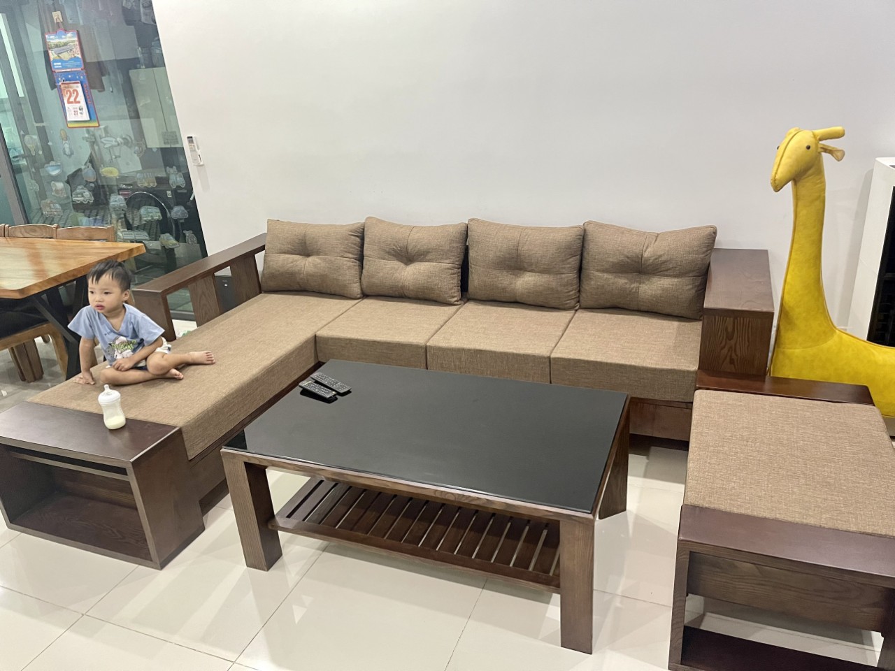 Bộ bàn ghế phòng khách sofa gỗ kích thước rộng 3m2*2m5 gỗ sồi lau pha màu óc chó